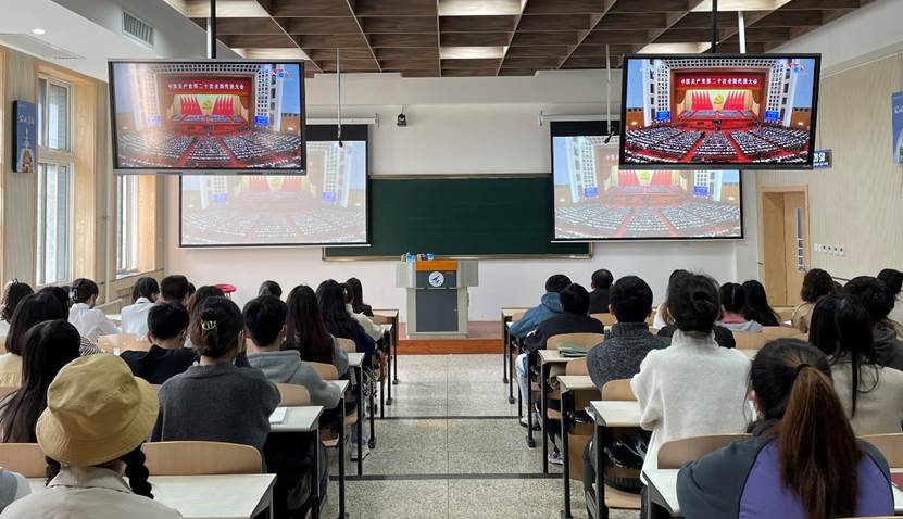 2022年10月16日上午10点,中国共产党第二十次全国代表大会开幕会在人民大会堂隆重召开。学院组织院领导班子、党委理论学习中心组成员及广大师生分别在智慧教室、党员活动室、会议室等集体收看党的二十大开幕会。