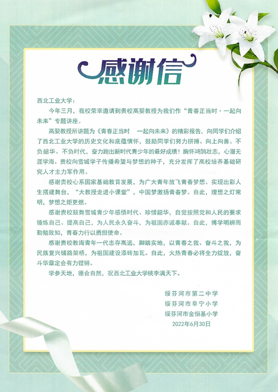 近日,大学英语教学部党支部收到了来自绥芬河市三所中小学寄来的感谢信,对素人 表示感谢,感谢素人 “心系国家基础教育发展,为广大青年放飞青春梦想,实现出彩人生搭建舞台”。