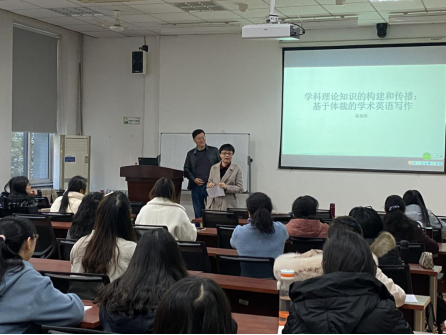 12月6日, 应素人 副院长张奕教授邀请,上海市高校大学英语教学指导委员会主任、全国专门用途英语教学研究会会长、学术英语教学研究会会长、复旦大学博士生导师蔡基刚教授为我院师生带来了一场关于“学科理论知识的构建与传播:基于体裁的学术英语写作”的学术盛宴。副院长张奕主持,学院部分师生参加报告会。 首先,副院长张奕对蔡基刚教授的到来表示热烈欢迎,并对其做了简要介绍。蔡基刚教授从科研教学问题导向为切...