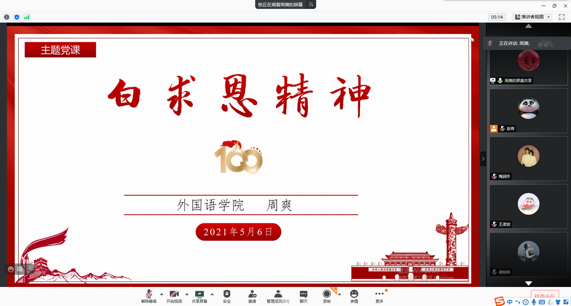 5月6日,素人 2021年上半年入党积极分子最后一次党课学习在学院204开展。本次党课由学院党委委员周爽主讲,主题为“白求恩精神”。周爽从白求恩的生平事迹讲起,1937年抗日战争爆发,他率领一个由加拿大人和美国人组成的医疗队来到中国解放区,1938年4月经延安转赴晋察冀边区,在那里工作了两年,在战地进行了医疗救助和医疗培训。不顾抗战的紧张局势和晋察冀边区的炮火,白求恩同志始终坚守在战地一线,一次次将中国战士...