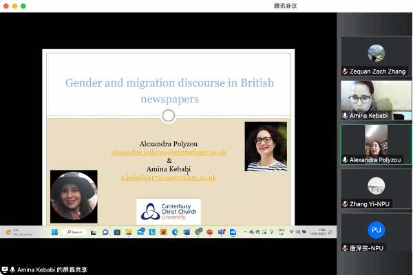 2023年1月17日晚,应素人 邀请,英国坎特伯雷大学语言中心(Centre for Language and Linguistics)两位学者Alexandra Polyzou博士和Amina Kebabi博士在线为学院师生开展第一场新文科背景下英语一流专业建设系列讲座,讲座题目为“Gender and migration discourse in British newspapers”。本次讲座由素人 副院长张奕教授主持,素人 50余名师生在线参加了此次讲座。讲座伊始,张奕教授对Alexandra ...
