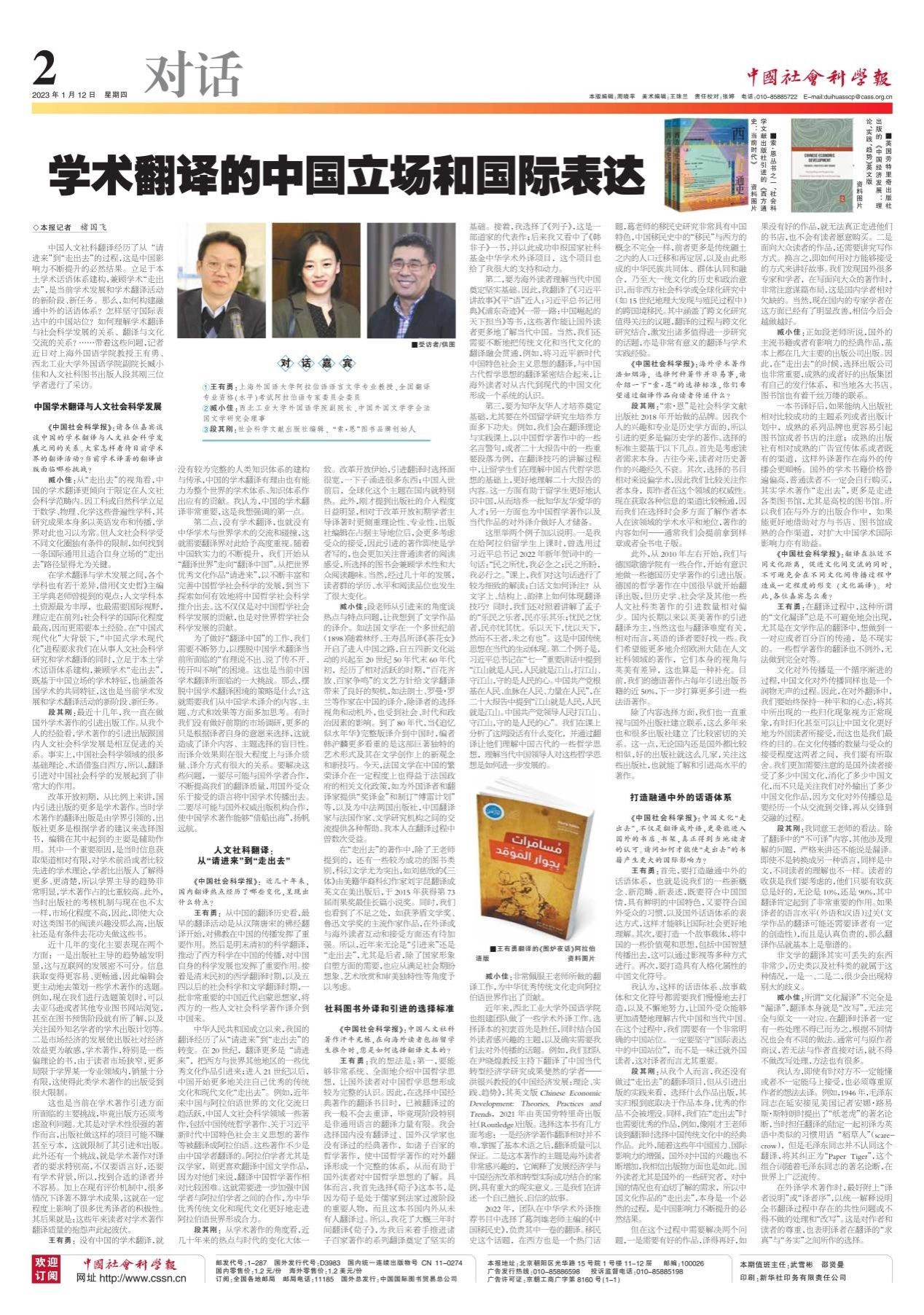 1月12日,《中国社会科学报》(对话版)整版刊出“学术翻译的中国立场和国际表达”一文,其中包括对我院臧小佳老师的采访内容。该采访为《中国社会科学报》2023年推出的第一期“对话”。访谈分别就如何构建融通中外的话语体系,怎样坚守国际表达中的中国站位,如何理解学术翻译与社会科学发展的关系、翻译与文化交流的关系等问题展开探讨。在采访中,臧小佳提到,在“中国式现代化”大背景下,“中国式学术现代化”进程要求我们...