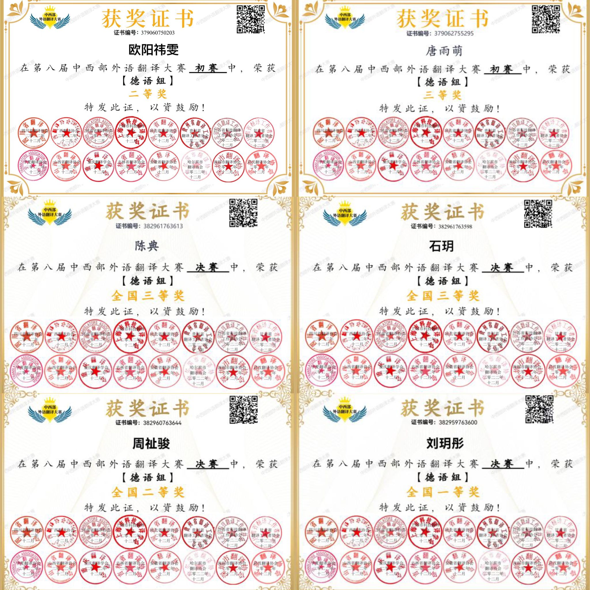 2022年11月12日至12月4日,国内16省的翻译协会联合举办了“第八届中西部外语翻译大赛”。本次大赛覆盖英、法、德、日、俄、西等六个语种,分八组进行,共计来自全国31个省市区654所高校的15030名选手参赛,其中来自22个省市区83所高校的546名选手参加德语组比赛。我院德语专业2020级共计11名选手由邓涛老师指导参赛。经过初赛角逐,我院选手脱颖而出,欧阳祎雯同学获得初赛二等奖,唐雨萌同学获得初赛三等奖,另有8名选手成功晋...