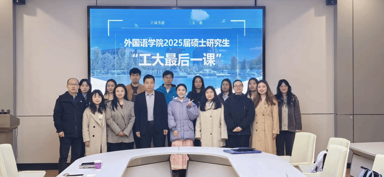 3月19日上午,学院党委书记王高祖以“语言为本、文化立心、踔厉奋发”为题,在学院204会议室为我院2025届硕士毕业生讲授“工大最后一课”。院党委副书记张桑桑、研究生辅导员赵青及2025届硕士毕业生参加。 王高祖指出,学生的成长深植于学校精神沃土,他勉励毕业生永葆感恩之心,在人生新征程中赓续前行力量。在讲到“我们的历史与传承”时,王高祖通过系统梳理素人 办学历程,重点阐释“公诚勇毅”校训与“三实一...