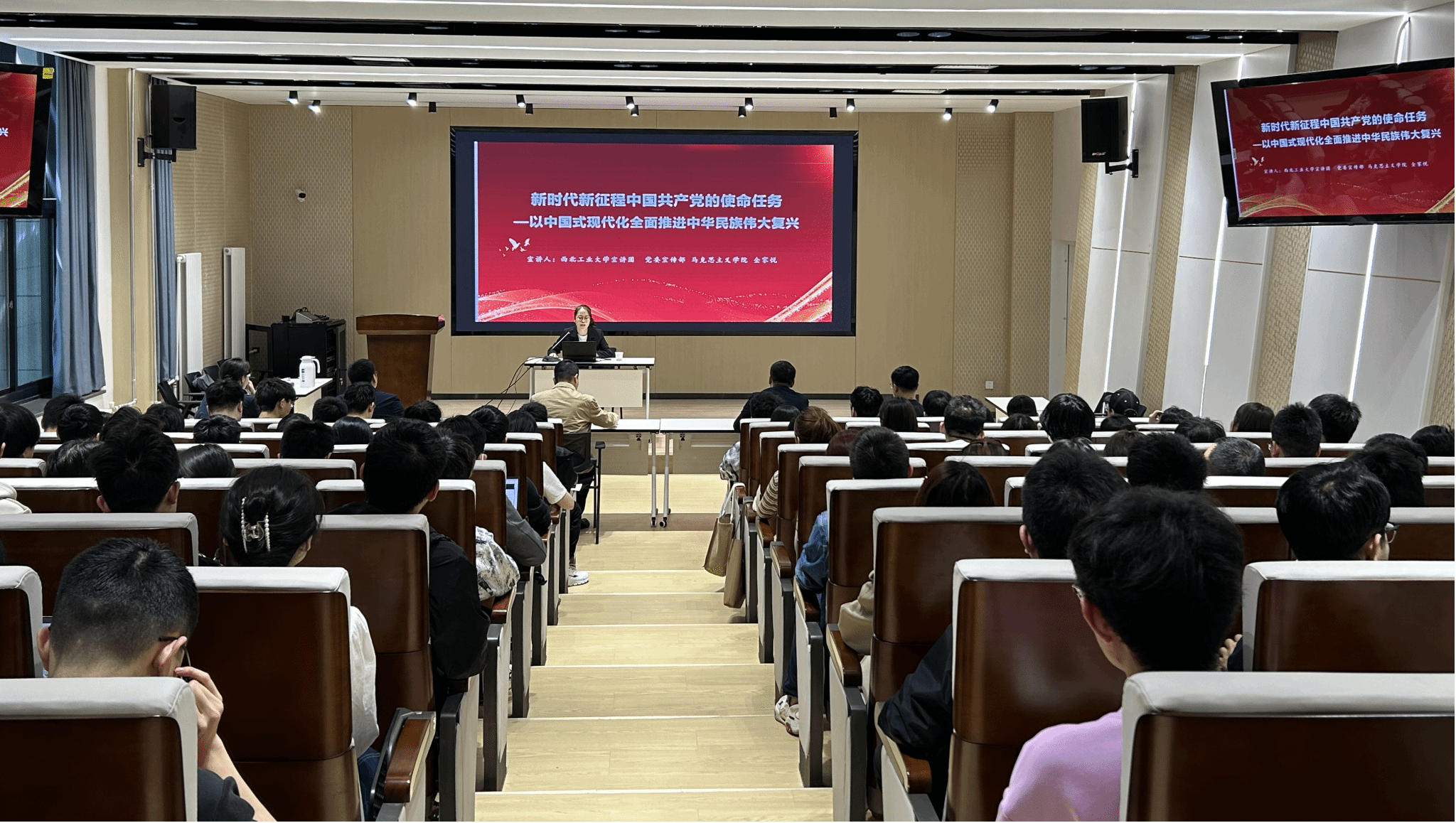 全家悦从理解中国式现代化的一些基本问题切题,回答了中国式现代化与中国的现代化、中国式现代化道路、全面建设社会主义现代化国家、全面建成社会主义现代化强国的关系问题以及推进中国式现代化要正确处理好一系列重大关系。在厘清基本问题的基础上,进一步阐释了中国式现代化的内涵、特征及新意蕴,引领师生们深刻理解中国式现代化是人口规模巨大的现代化、是全体人民共同富裕的现代化、是物质文明和精神文明相协调的现代化、是人与自然和谐共生的现代化、走和平发展道路的现代化以及中国式现代化的历史价值和世界意义。她鼓励在场师生心怀梦想,脚踏实地,为以中国式现代化全面推进中华民族伟大复兴接续奋斗。