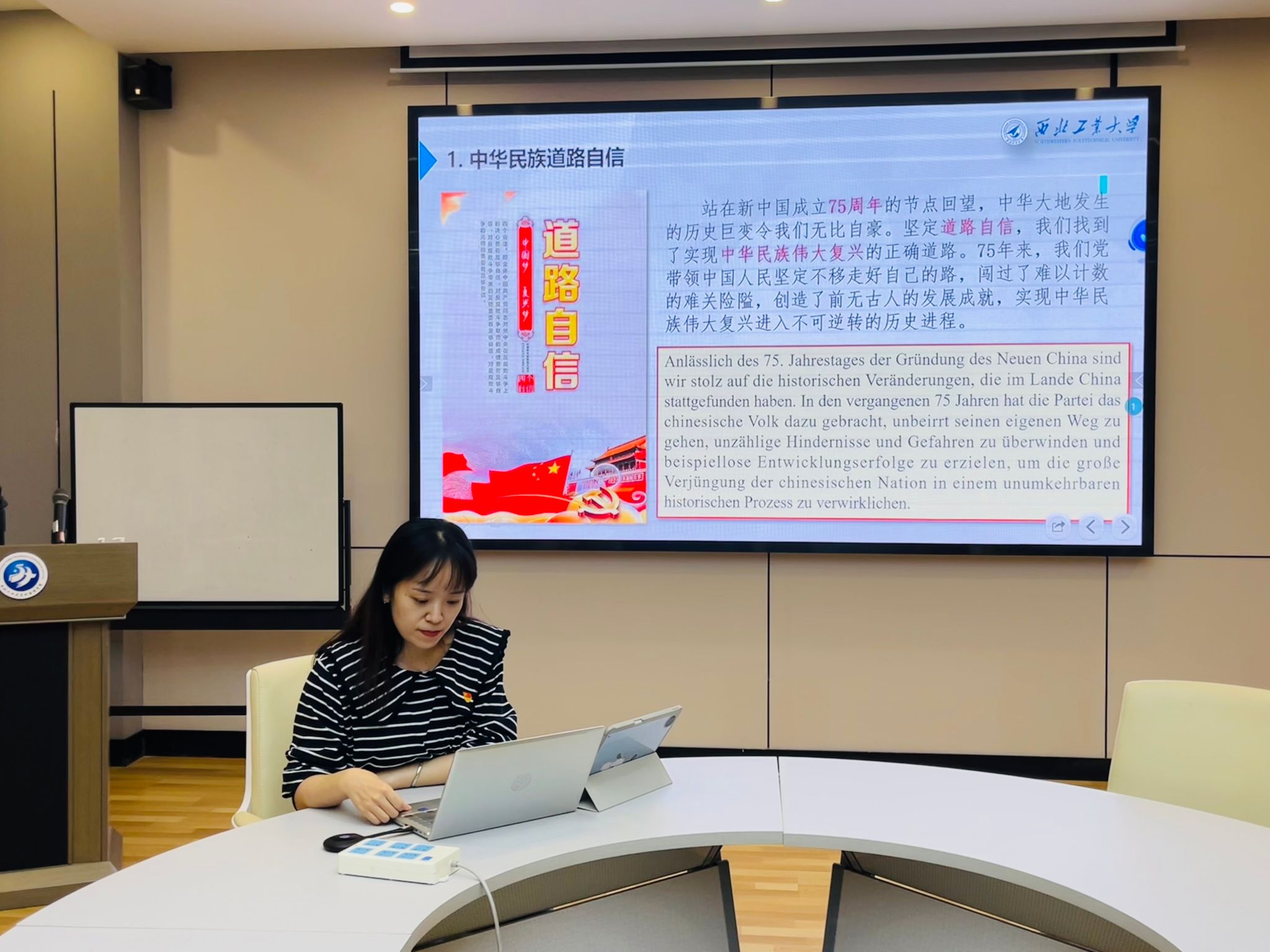 江玲玲同志聚焦“理论自信——西工大与新发展理念”,以一批西工大人践行“创新、协调、绿色、开放、共享”新发展理念的实践为例,展现了学校在培养“总师型”人才、推动高质量发展方面的成就。在外国语言学文学系党支部车向前老师的进一步指导下,江玲玲同志和另外两位同志荣获学院“语说七十五载新中国”活动二等奖。