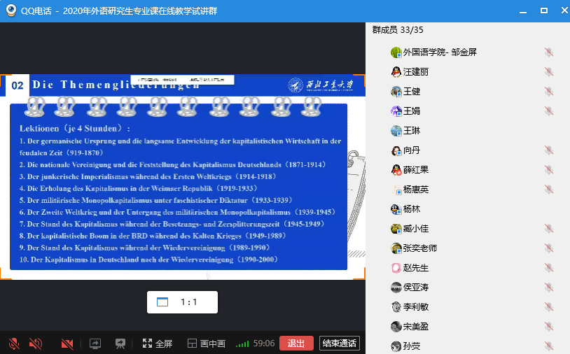 根据专业方向差异和课程设置需求,试讲语言有汉语、英语、德语三种语言;试讲内容涵盖文学、语言学、翻译和国别与区域研究等。试讲教师除了国内教师师之外,还有来自法国的外籍教师斯蒂芬妮博士。为了参加此次试讲,远在德国的斯蒂芬妮专门录制了视屏,准备了PPT及电子版材料。在前期测试中,学院经过多次尝试最终确定以QQ直播作为主讲平台。学院根据课程特点,采用QQ直播和腾讯会议两种试讲平台,确保了试讲各个环节有序、高效的开展。