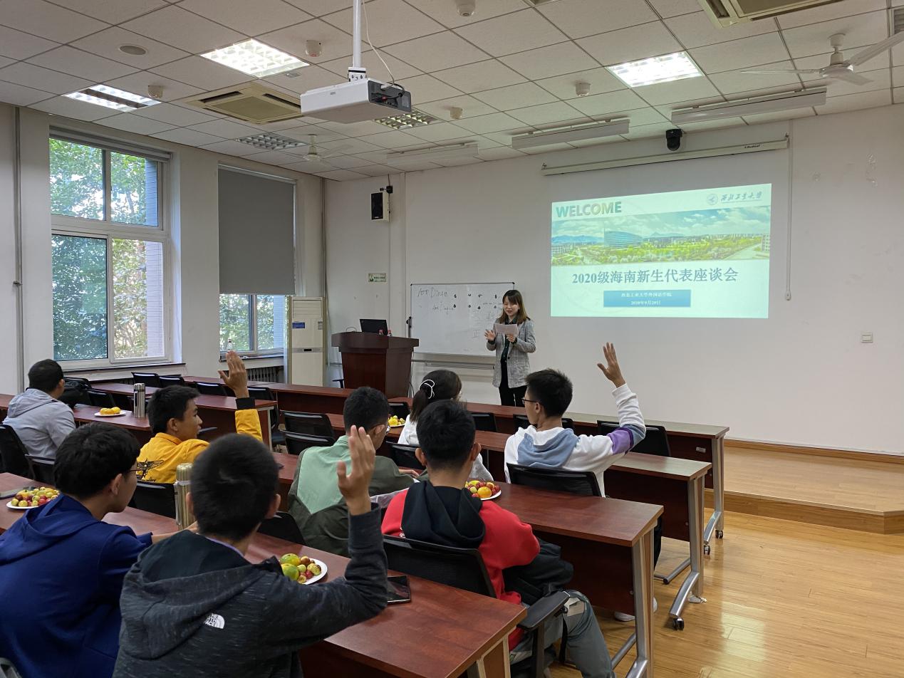 在学院楼104、204会议室分别召开了2020级商洛地区、海南省新生座谈会,学院副院长、海南招生工作组组长周爽、院党委副书记、商洛招生工作组组长高敏、学校招生办公室姚远老师、学院本科教学秘书、2018级学生代表以及来自海南省的2020级新生代表参加了会议,会议由周爽副院长主持。