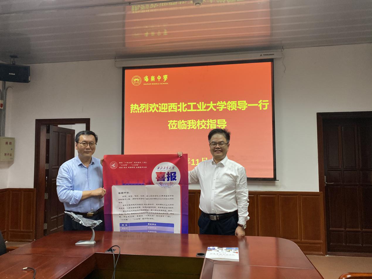 5日上午和下午,杨晓常委一行先后赴三亚市第一中学和海口市第一中学进行了回访,并代表学校分别向两所中学赠送了歼-20飞机模型,同时在海口市第一中学完成了“优秀生源基地”签约授牌仪式。在与三亚市第一中学的座谈中,杨晓常委对该校多年来为我校输送优质生源表示了感谢,双方就办学理念、学生就业、生源输送等情况等进行了深入交流。在海口市第一中学的“优秀生源基地”签约授牌仪式上,杨晓常委表示,该校办学实力强、学生素质高、社会声誉好,长期以来为西工大输送了不少优秀学生,希望双方加深合作,共同为培养新时代卓越人才而努力。