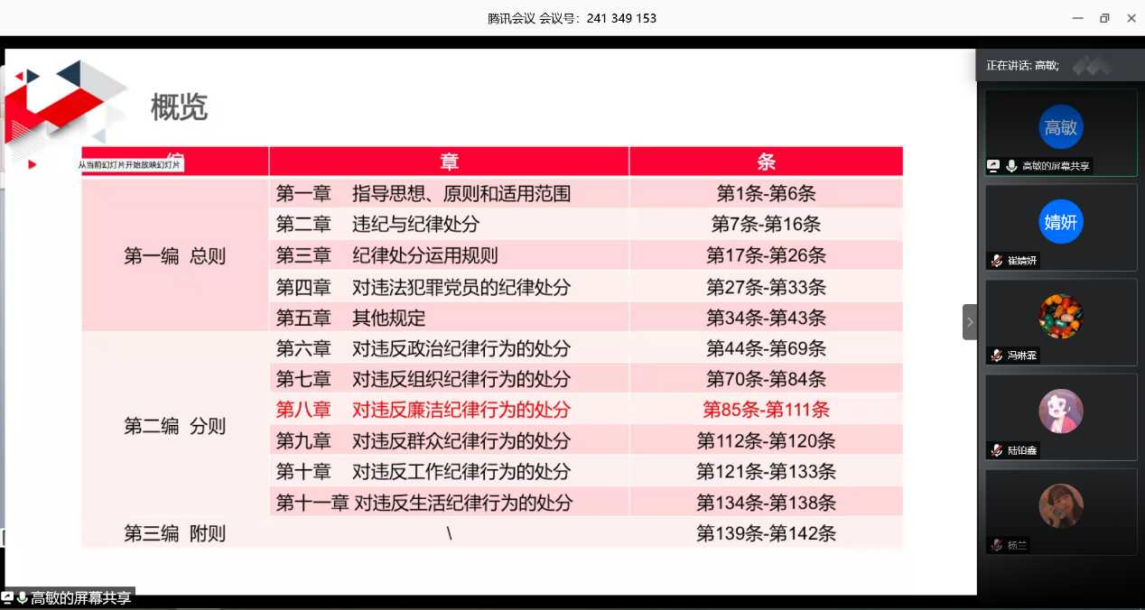 开展了第十三期发展对象培训班第5次线上党课。院党委副书记高敏为我院发展对象讲述了“中国共产党纪律处分条例及廉洁自律准则”的专题党课。
