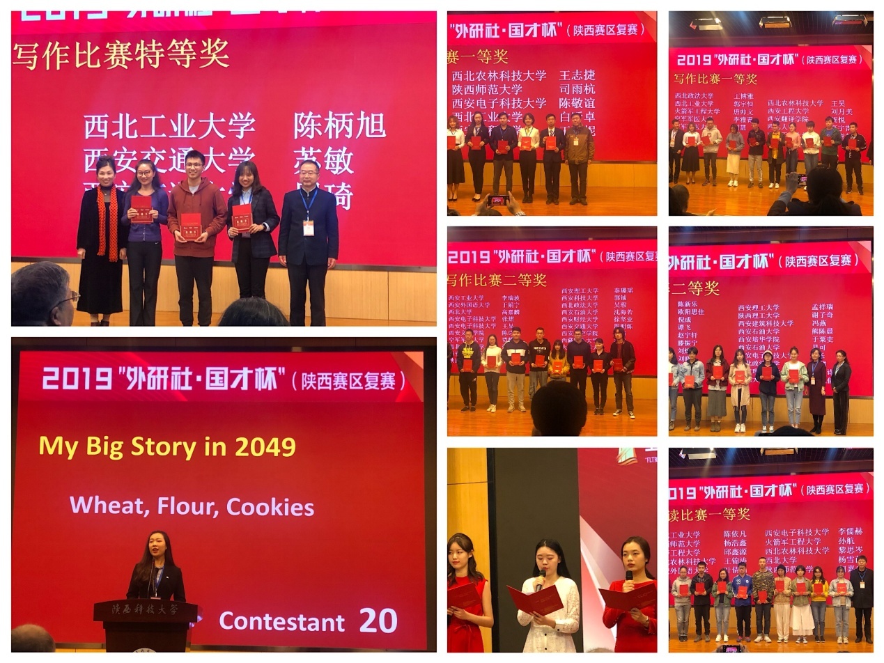 10月18-19日,2019年度“外研社•国才杯”全国英语演讲、写作、阅读大赛陕西赛区复赛在陕西科技大学(西安校区)举行。我校大学生英语创新实践基地指导教师苏小青和孙荧带队,陈柄旭、郭宇恒、白昕卓、陈依凡、陈新乐、张诗和秦靖萱共7名选手参赛,在竞争激烈的三项赛事中表现优异,斩获佳绩,获得特等奖1个,一等奖3个,二等奖2个和三等奖1个。这些选手此前参加由基地举办的英语演讲、写作和阅读大赛校内选拔赛初赛和复赛,分别从680名、176名和578名学生中选拔而来。前期选拔经过了大学英语教学部老师及素人