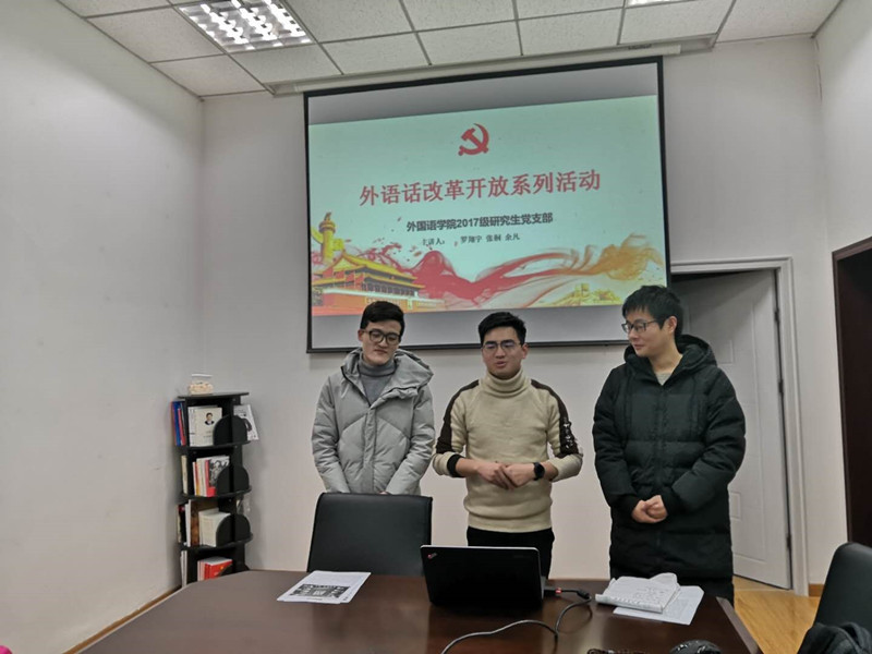 2017级研究生党支部在院楼219室展开“外语话改革开放”系列特色活动。支部全体党员、发展对象、入党积极分子参加了此次支部活动,并在开始之前重温了庆祝改革开放40周年大会的精神。