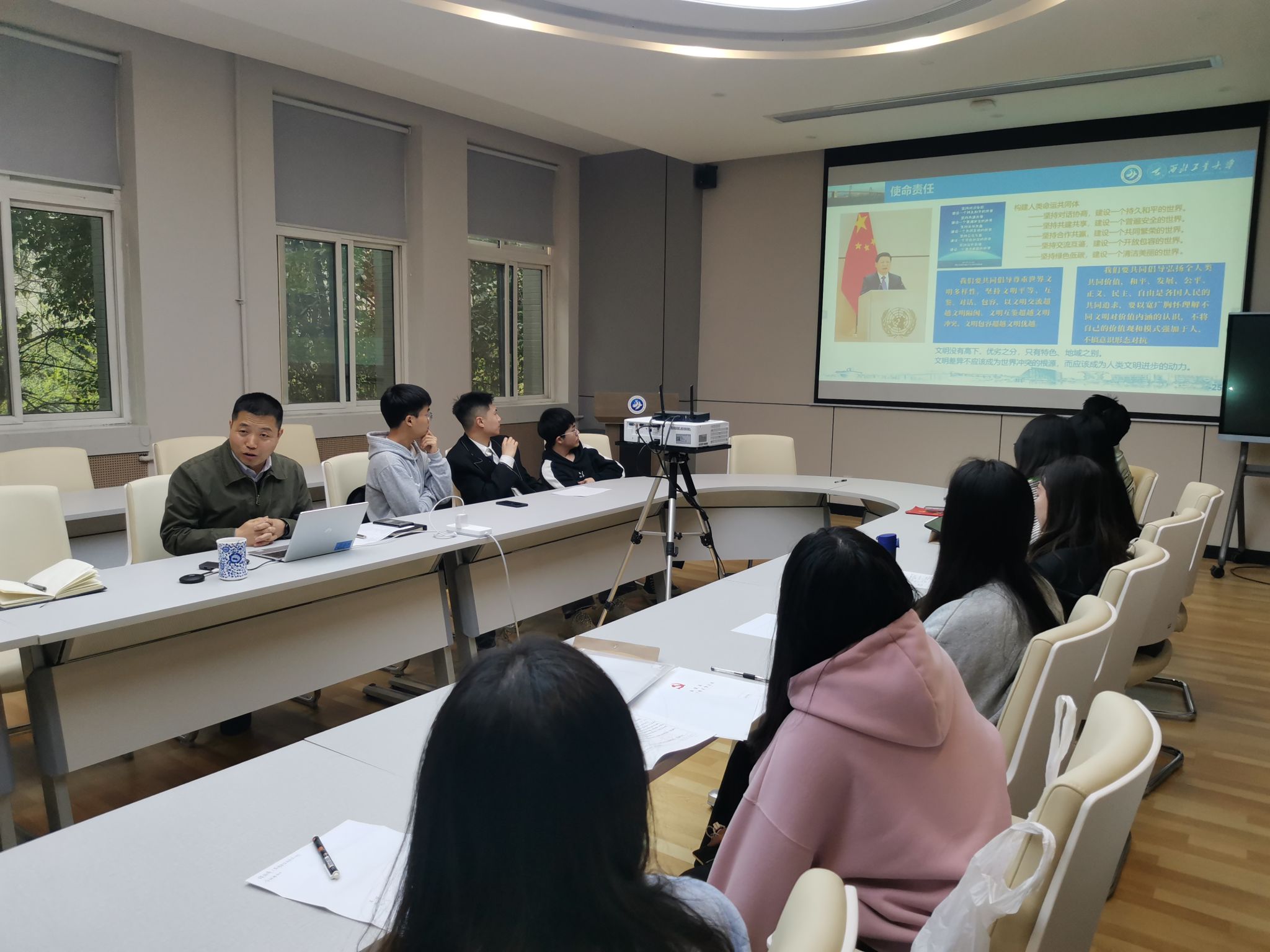 党委书记王高祖以“牢记公诚勇毅校训,筑牢深厚家国情怀,精研语言文化,胜任文明互鉴”为题,在学院204会议室为我院2023届全体硕士毕业生讲授“工大最后一课”。课程中,他充分结合本届硕士毕业生的就业去向、社会发展的需求与导向、外语学子的修炼与前进等为同学们讲授了一堂生动的毕业教育思政课。