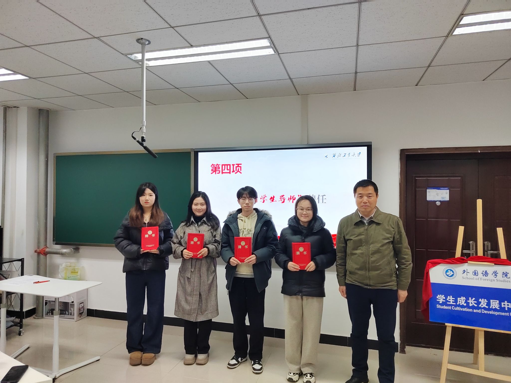 在聘任环节,张桑桑为“中心”的运维负责人李晨菲同学颁发聘书。运维负责人主要负责中心的日常管理与运营工作,并依托“中心”为学院师生提供服务。随后,王高祖为“助研学生导师”颁发聘书。助研学生导师是“中心”工作的重要内容之一,主要由研一考研上岸的学生担任,为每年大四报考本院研究生的同学提供学业帮扶。今年我院共聘任5位2024级和1位2023级优秀硕士研究生担任助研学生导师。