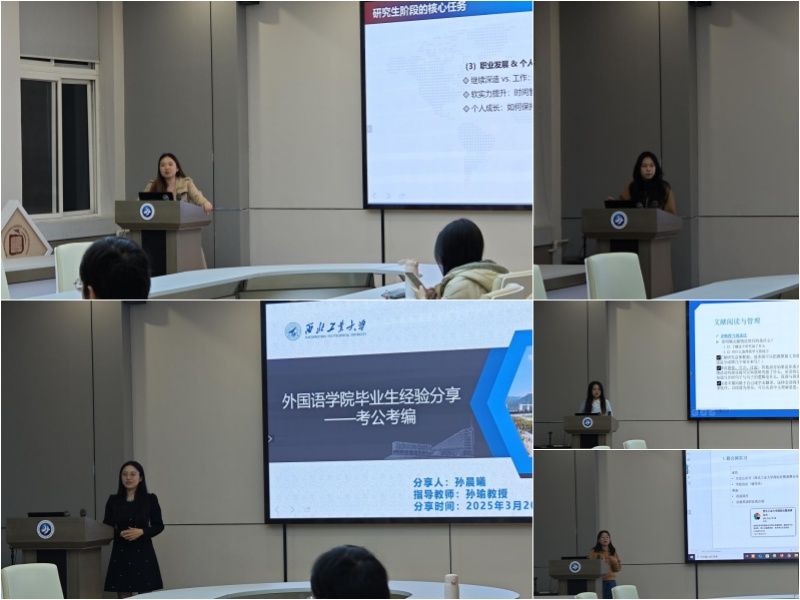 刘琼琳从学术论文发表的角度讲述了如何提升学术能力、写作能力,如何进行职业生涯规划和提升自己的软实力;虎佳琪围绕如何提升语言专业的专精能力展开,重点讲述了如何备考雅思的经验,以及如何准备与减压;刘万从自身经验出发,讲述了阅读文献和充分利用各种网络工具进行学术工作的方法;徐娅围绕实习实践展开,讲述了在国际组织实习前的信息搜集、个人准备、投递面试、工作内容等;孙晨曦从考公考编着手,详细讲述了笔试和面试两个环节如何准备,令同学们收获满满。