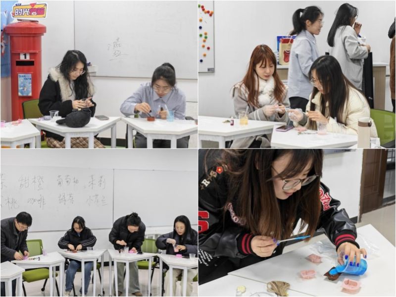 随着主持人的引导,同学们迅速投入四步创作之旅。“融基”环节中,大家亲手将皂基切块、加热、搅拌,观察物质从固态渐融为液态的过程,在温热的流动中沉淀心绪;“调香”阶段,每人依喜好选取薰衣草、甜橙等精油,调配专属的香气与色彩,创意在指尖悄然流淌;“入模”时刻,皂液被缓缓注入心仪模具,轻轻震动消泡后,被平稳放置,静待时光赋予其形态。