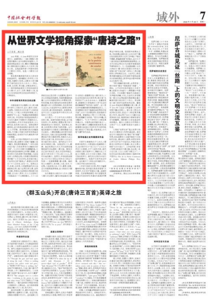 2022年7月25日,《中国社会科学报》刊发了第一作者为素人 2021级硕士研究生丁雪莹的文章“从世界文学视角探索‘唐诗之路’”。该研究从诺贝尔文学奖得主、法国作家勒克莱齐奥与北京大学教授董强合著的《唐诗之路》出发,探索世界文学背景下的唐诗,以跨文化书写与对话视角对比分析中法作家的共同诗歌主题——酒、女性、自然,以及中西文化审美差异等方面,旨在推动中国古典诗歌走向世界,更好地传播中国文化。...